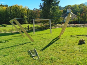 como no queremos hacer una casa en Amalurra, simplemente dejamos presentada una instalación, 3 porterías unidas por 3 cinchas azules,