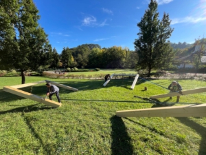 hace una semana hemos hecho nuestra primera instalación, 3 porterías para jugar al futbol, con 6 vigas (abeto laminado de sección cuadrada de 20 cm), con cajera para 3 vigas de 10 por 20 cm.